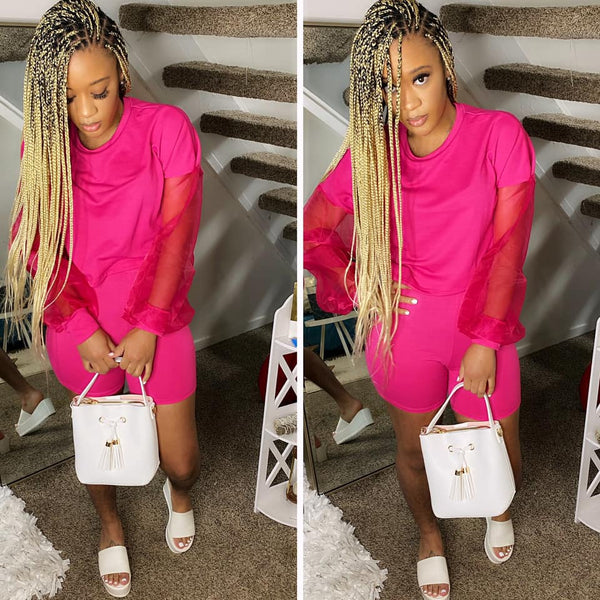 The 2 piece biker set has sheer sleeves, with some stretch .